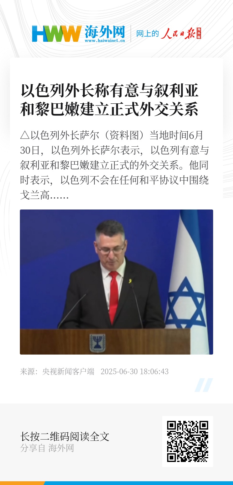 当地时间6月30日,以色列外长萨尔表示,以色列有意与叙利亚和黎巴嫩建立正式的外交关系。他同时表示,以色列不会在任何和平协议中围绕戈兰高地问题进行谈判。(总台记者 周宣)