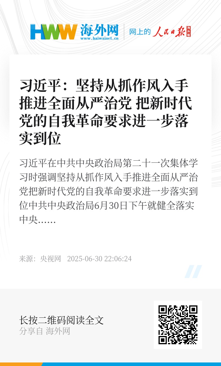 中共中央政治局6月30日下午就健全落实中央八项规定精神、纠治“四风”长效机制进行第二十一次集体学习。中共中央总书记习近平代表党中央,向全国广大共产党员致以“七一”的节日问候!他在主持学习时强调,自我革命是我们党跳出治乱兴衰历史周期率的第二个答案,从抓作风入手推进全面从严治党是新时代党的自我革命一条重要经验。推进党的自我革命,要在提高认识、增强党性、规范权力运行、从严监督执纪、履行管党治党责任等方面进一步落实到位。