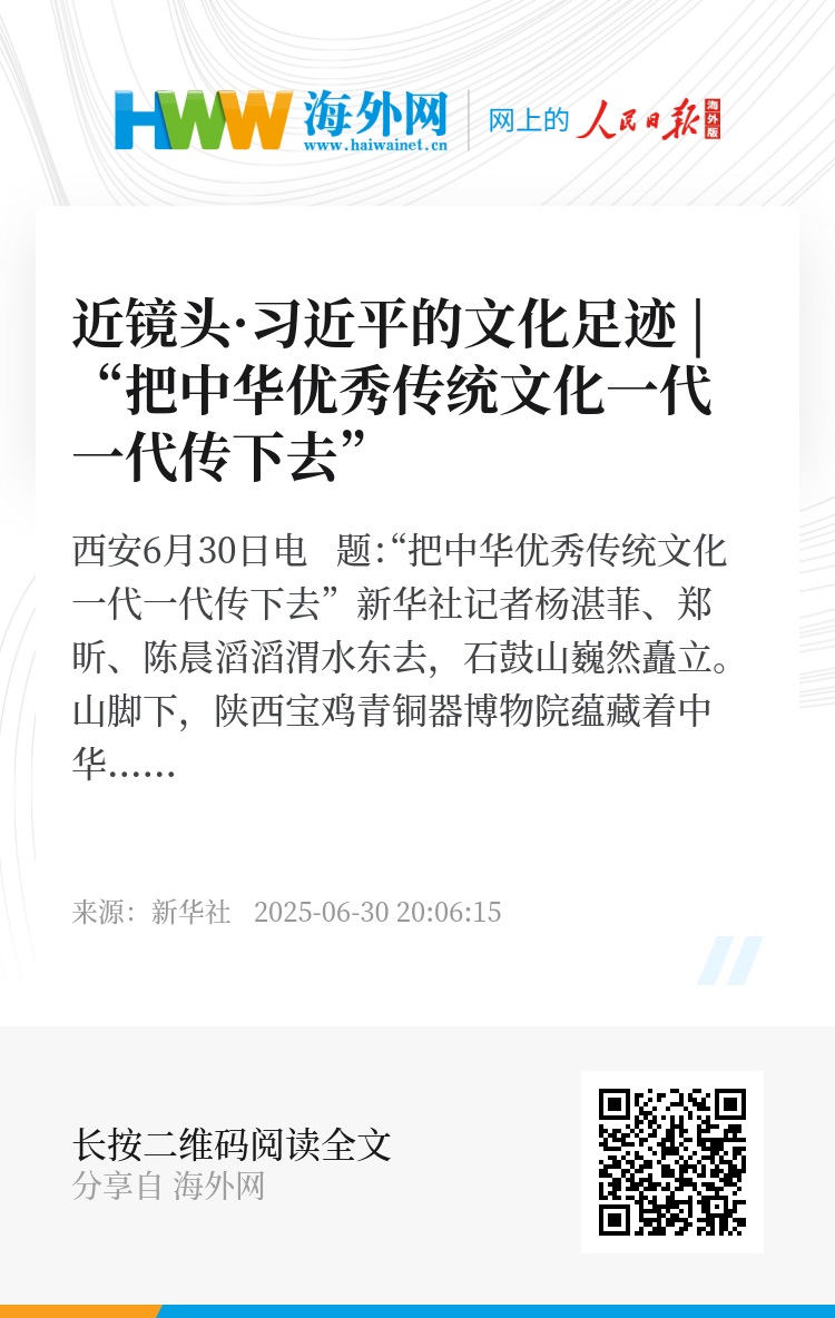 新华社西安6月30日电 题:“把中华优秀传统文化一代一代传下去”