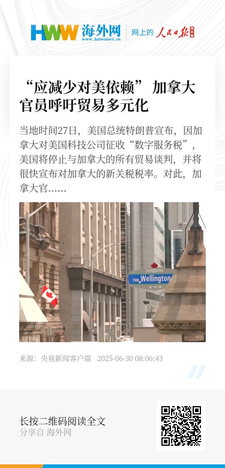 当地时间27日,美国总统特朗普宣布,因加拿大对美国科技公司征收“数字服务税”,美国将停止与加拿大的所有贸易谈判,并将很快宣布对加拿大的新关税税率。对此,加拿大官员呼吁政府加快实现贸易多元化,摆脱对美依赖。