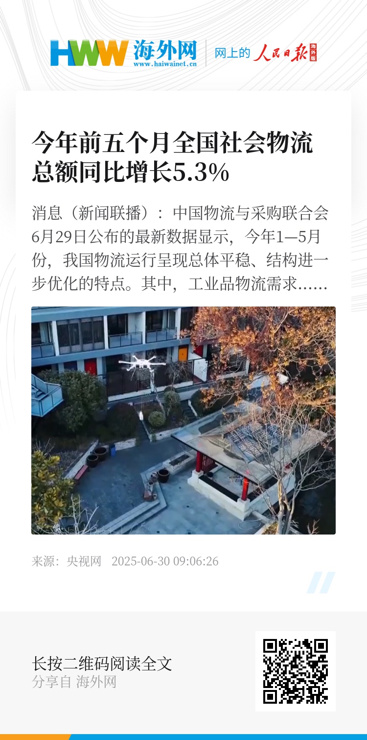 央视网消息(新闻联播):中国物流与采购联合会6月29日公布的最新数据显示,今年1—5月份,我国物流运行呈现总体平稳、结构进一步优化的特点。其中,工业品物流需求增势平稳,民生消费物流需求加速释放。