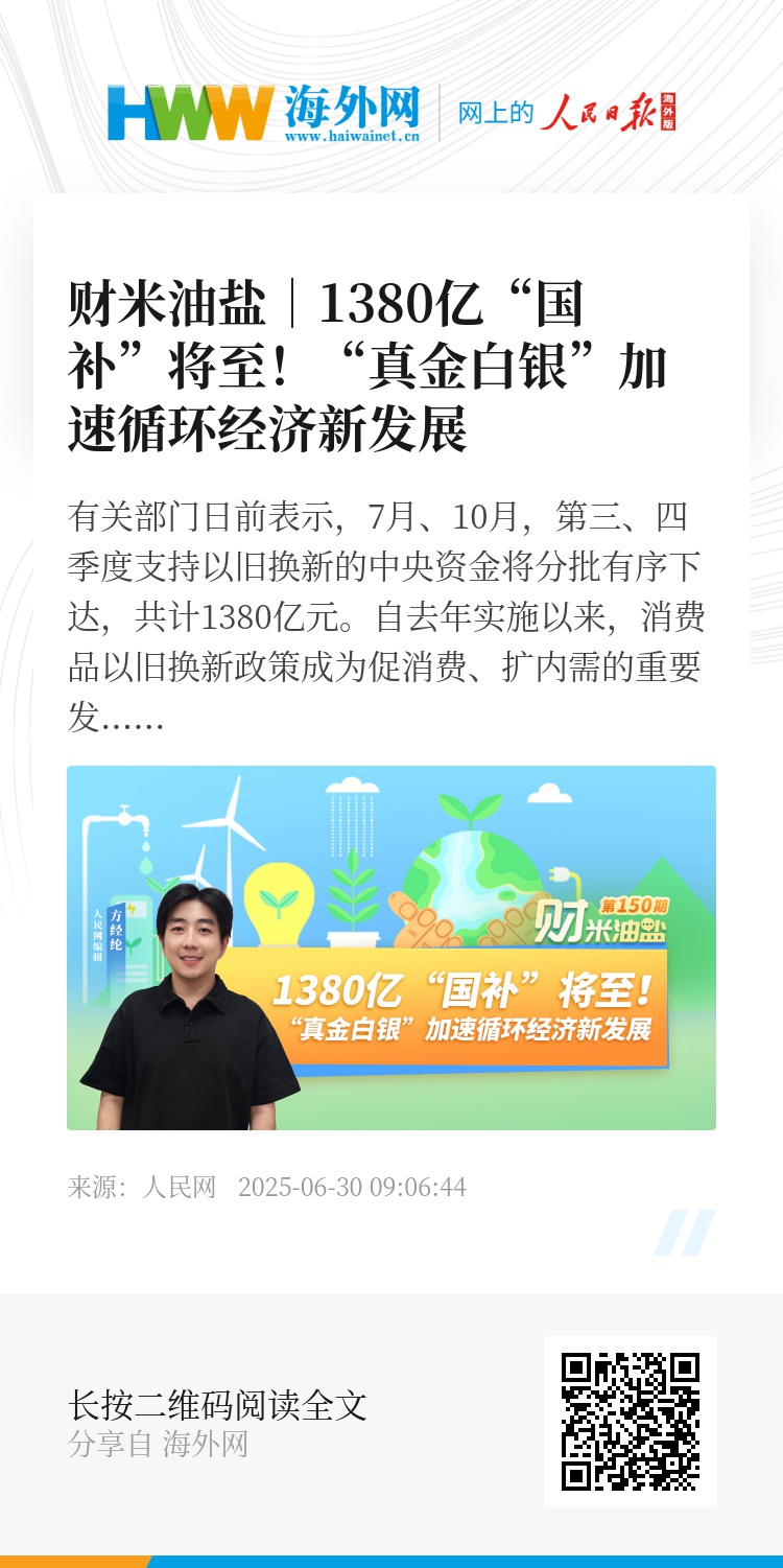 有关部门日前表示,7月、10月,第三、四季度支持以旧换新的中央资金将分批有序下达,共计1380亿元。