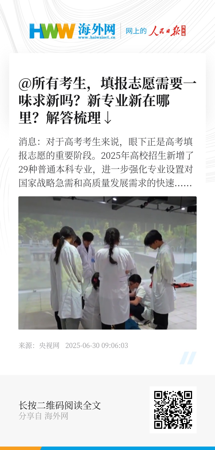 央视网消息:对于高考考生来说,眼下正是高考填报志愿的重要阶段。2025年高校招生新增了29种普通本科专业,进一步强化专业设置对国家战略急需和高质量发展需求的快速响应。这些新专业新在哪里?对于考生来说,填报志愿需要一味求新吗?
