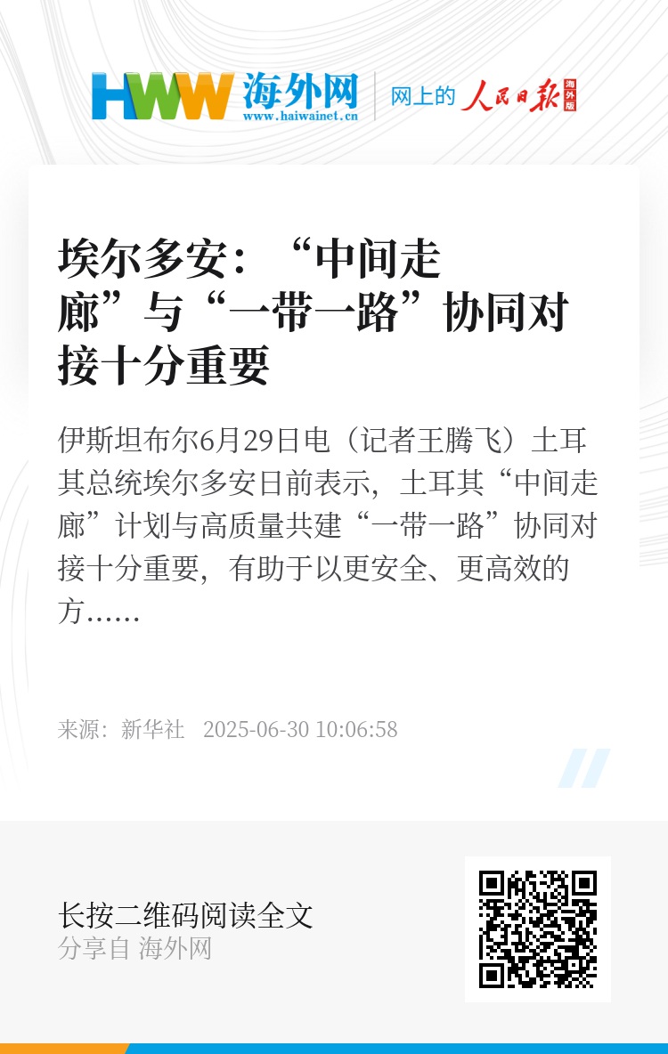 新华社伊斯坦布尔6月29日电(记者王腾飞)土耳其总统埃尔多安日前表示,土耳其“中间走廊”计划与高质量共建“一带一路”协同对接十分重要,有助于以更安全、更高效的方式连接亚洲与欧洲。