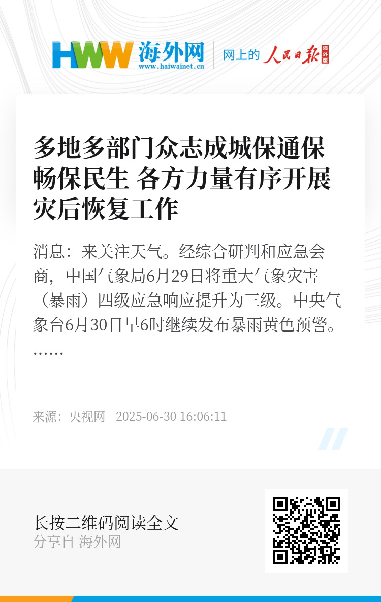 央视网消息:来关注天气。经综合研判和应急会商,中国气象局6月29日将重大气象灾害(暴雨)四级应急响应提升为三级。中央气象台6月30日早6时继续发布暴雨黄色预警。