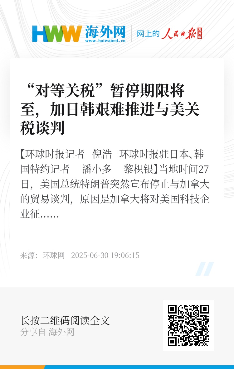 【环球时报记者 倪浩 环球时报驻日本、韩国特约记者 潘小多 黎枳银】当地时间27日,美国总统特朗普突然宣布停止与加拿大的贸易谈判,原因是加拿大将对美国科技企业征收“数字服务税”,特朗普称此为“公然的攻击”。路透社称,美国此举将原本趋缓的美加关系重新拖入混乱。在此前的G7会议上,特朗普与加拿大总理卡尼曾友好会晤并同意在30天内达成新的经济协议。随着所谓“对等关税”90天的暂停期即将截止,与美国的关税成为不少国家任务清单上的关键事项,日本、韩国有关代表近日再次前往华盛顿就关税问题进行谈判,但据日韩媒体报道,谈判进展仍然有限。