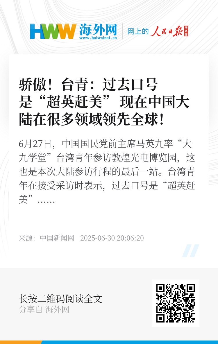 6月27日,中国国民党前主席马英九率“大九学堂”台湾青年参访敦煌光电博览园,这也是本次大陆参访行程的最后一站。台湾青年在接受采访时表示,过去口号是“超英赶美”,现在中国大陆在很多领域领先全球。(记者 李佳悦 路梅 制作 金彤阳)