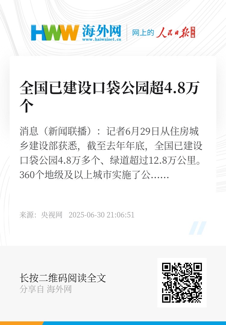 央视网消息(新闻联播):记者6月29日从住房城乡建设部获悉,截至去年年底,全国已建设口袋公园4.8万多个、绿道超过12.8万公里。360个地级及以上城市实施了公园绿地开放共享,轮换开放草坪1.8万余公顷,增加健身设施18万多件。