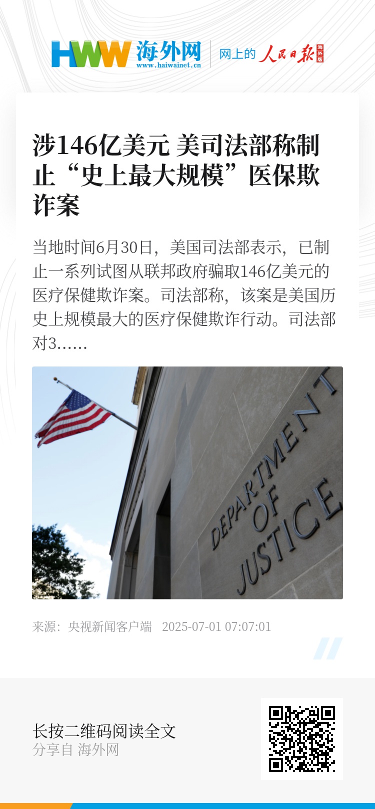 当地时间6月30日,美国司法部表示,已制止一系列试图从联邦政府骗取146亿美元的医疗保健欺诈案。