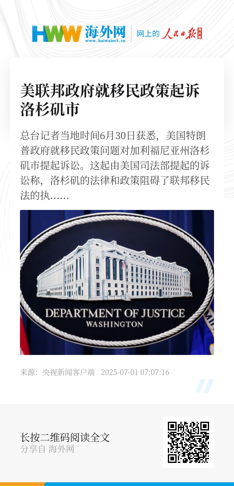 总台记者当地时间6月30日获悉,美国特朗普政府就移民政策问题对加利福尼亚州洛杉矶市提起诉讼。