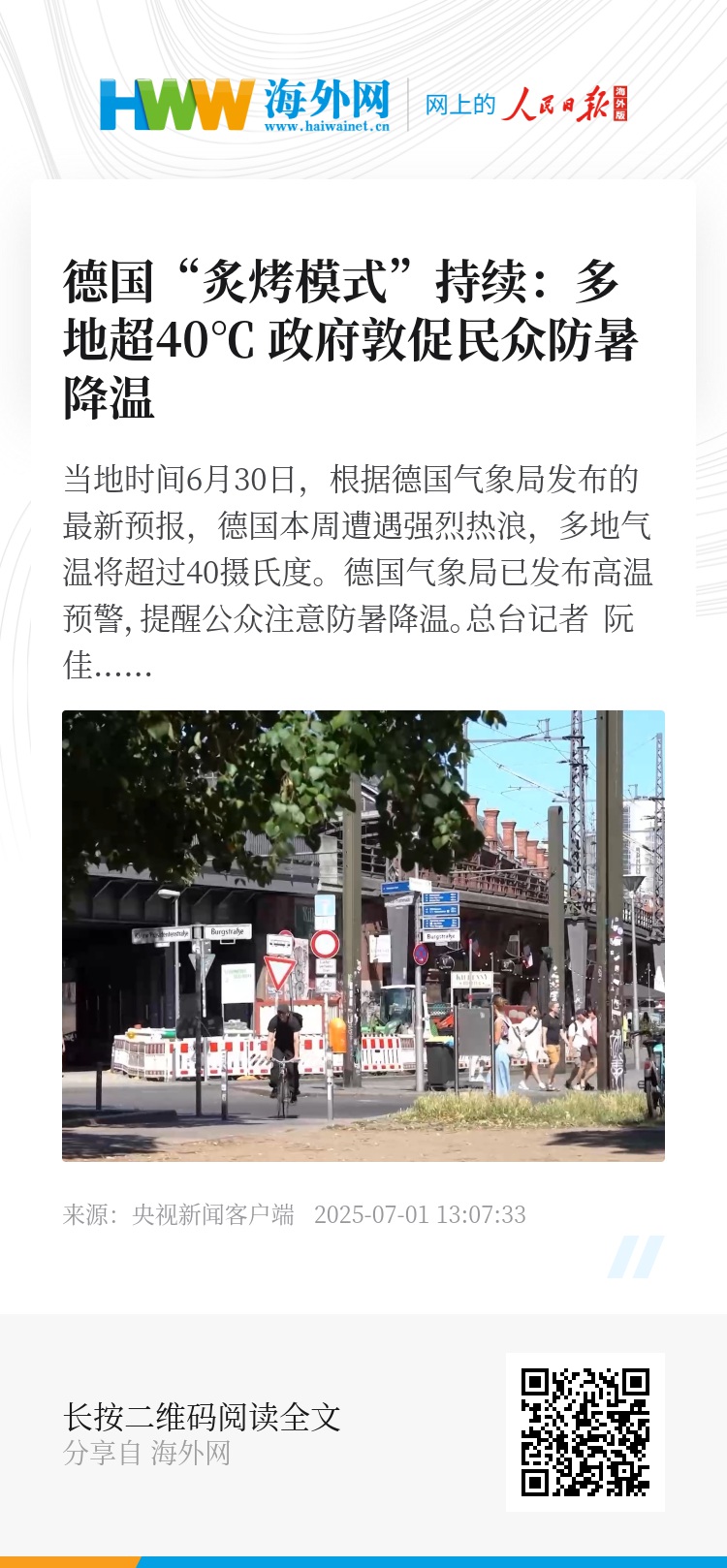 当地时间6月30日,根据德国气象局发布的最新预报,德国本周遭遇强烈热浪,多地气温将超过40摄氏度。德国气象局已发布高温预警,提醒公众注意防暑降温。
