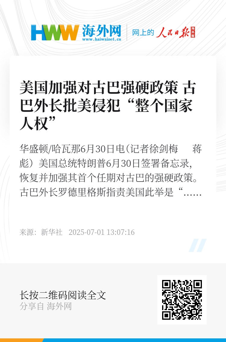 新华社华盛顿/哈瓦那6月30日电(记者徐剑梅 蒋彪)美国总统特朗普6月30日签署备忘录,恢复并加强其首个任期对古巴的强硬政策。古巴外长罗德里格斯指责美国此举是“侵犯整个国家人权的犯罪行为”。