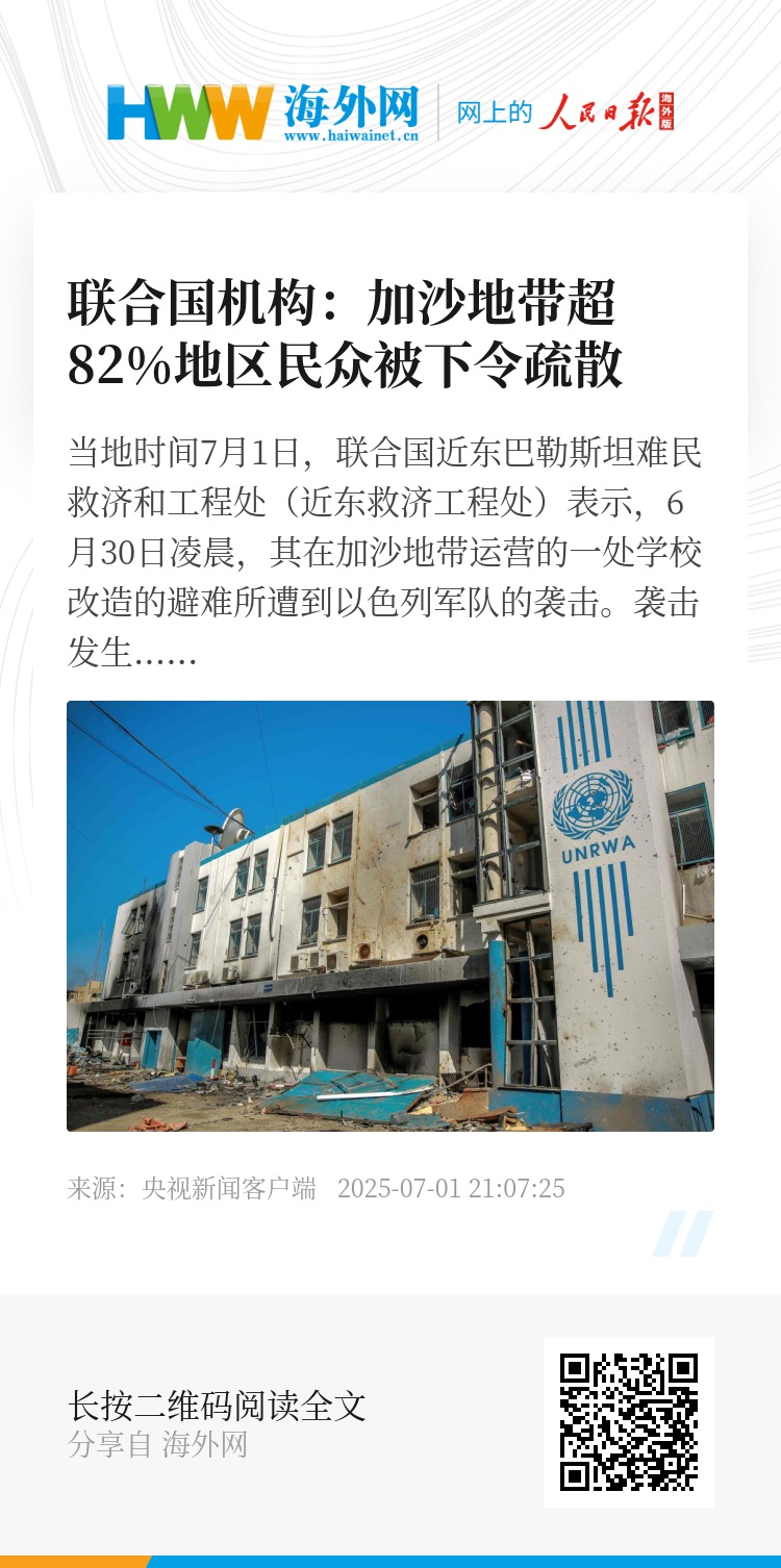 联合国近东救济工程处指出,超过82%的加沙地区已被下达疏散令,加沙民众无处可去。人道主义设施不是攻击目标,“请立即停火”。(总台记者 魏然)