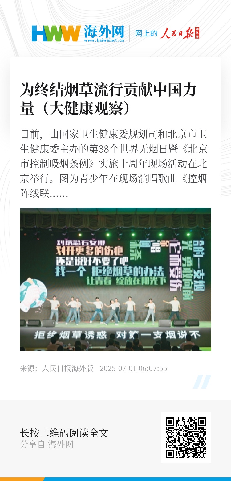 在中国,各高校学生正以富有创意的形式投身控烟事业。他们充分发挥创新能力和社交网络优势,以辩论赛、主题演讲、短视频创作、校园展览等互动形式科普烟草危害、传播控烟理念,有效扩大了控烟政策的影响力。这些做法不仅增强了青年群体自身的控烟意识,更带动了全社会对无烟环境的关注,有利于推进无烟文化的更大范围传播,为“健康中国”建设注入青春活力。(本报记者 王美华)
