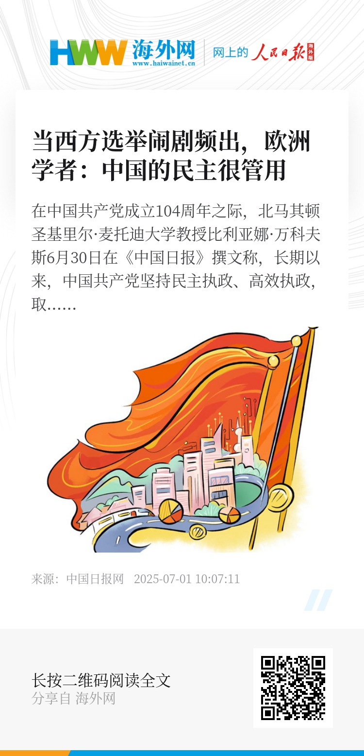 在中国共产党成立104周年之际,北马其顿圣基里尔·麦托迪大学教授比利亚娜·万科夫斯6月30日在《中国日报》撰文称,长期以来,中国共产党坚持民主执政、高效执政,取得了巨大的成就,证明了中国的民主制度是以合力促进增长与繁荣的高效方式。