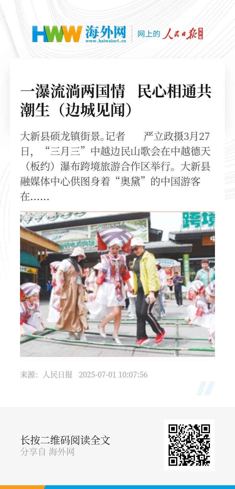 瀑声、歌声、赞美声、欢呼声……美妙的中越和鸣,也是美好的文化交响。“中越儿女心相连——”许秀珍的山歌越唱越响亮,呗侬心里越来越敞亮。