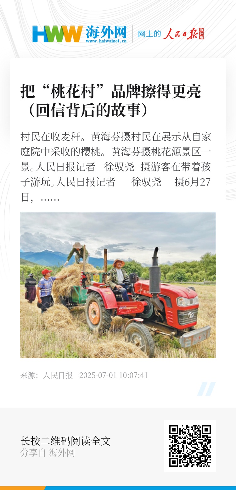 6月27日,习近平总书记给西藏林芝市巴宜区林芝镇嘎拉村全体村民回信指出:“希望你们在党的兴边富民好政策引领下,切实维护好民族团结,创造更加幸福美好的生活,把雪域高原的自然美景保护好,把‘桃花村’品牌擦得更亮,为建设繁荣稳固的祖国边疆贡献力量。”