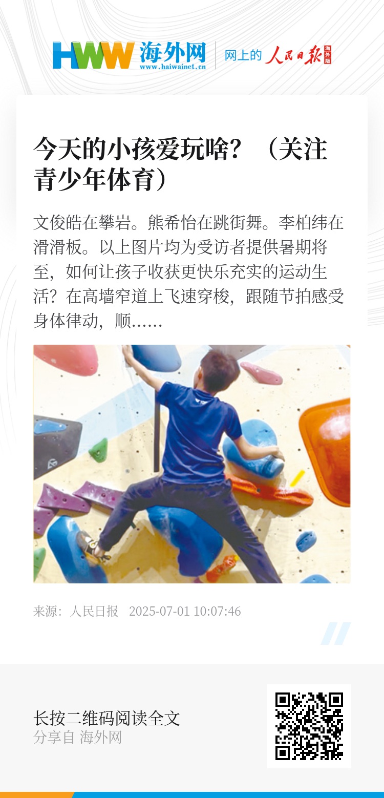 在高墙窄道上飞速穿梭,跟随节拍感受身体律动,顺着岩壁摸索向上的路径,脚下滑板腾空翻转如在云端……当下,跑酷、街舞、攀岩、滑板等成为不少“小孩哥”“小孩姐”的“心头好”。让我们一起“种草”孩子们的新潮运动,感受他们的自信与活力。