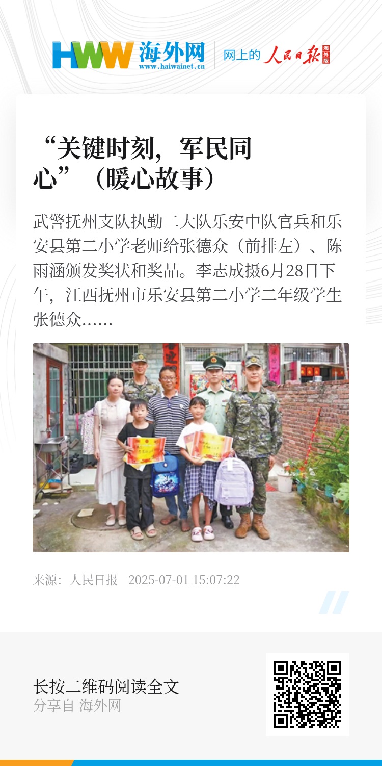 “张德众和陈雨涵两名小朋友见义勇为,救助一名老人,特此表扬,希望你们今后继续发扬雷锋精神!”武警乐安中队政治指导员吴少邛说。