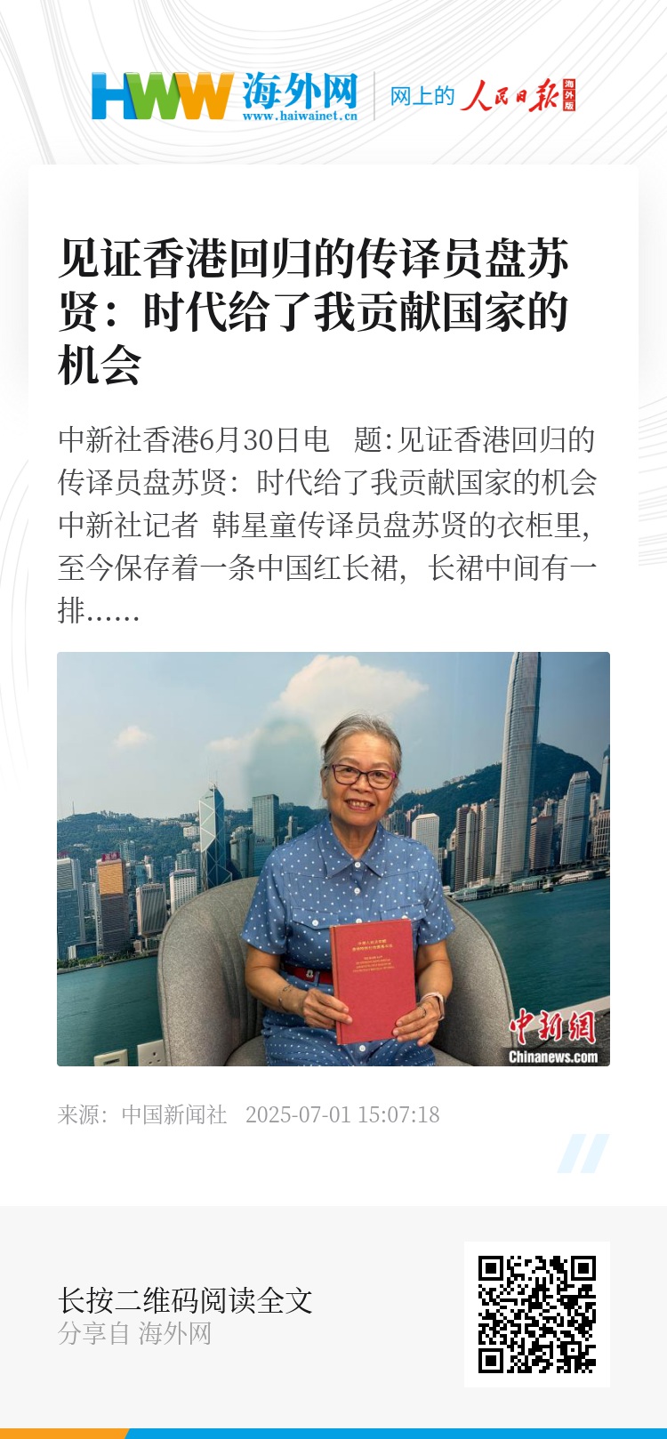 中新社香港6月30日电 题:见证香港回归的传译员盘苏贤:时代给了我贡献国家的机会