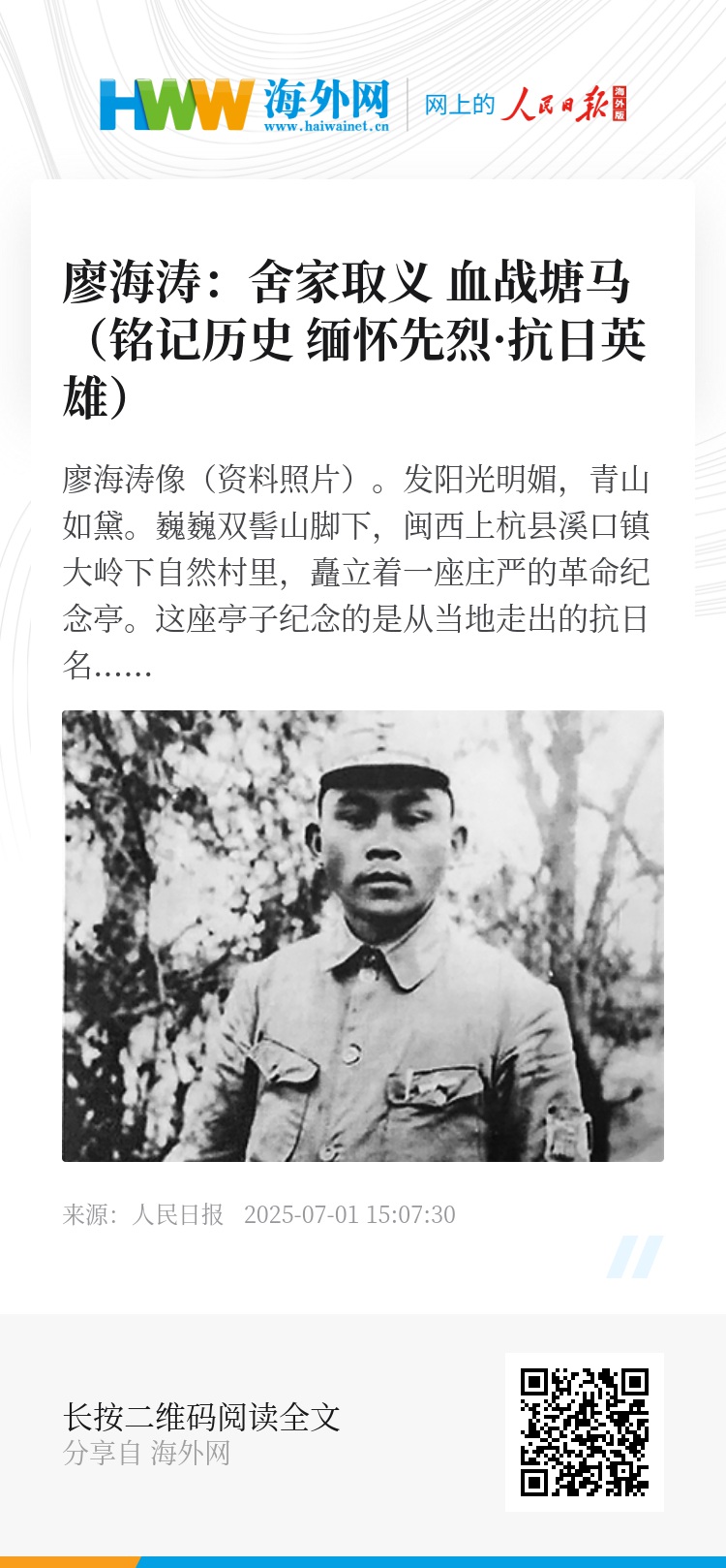 1941年,在江苏溧阳塘马战斗中,廖海涛为掩护新四军十六旅旅部机关和苏南抗日根据地干部突围转移,率部与日伪军浴血奋战,最终因伤势过重壮烈牺牲,年仅32岁。