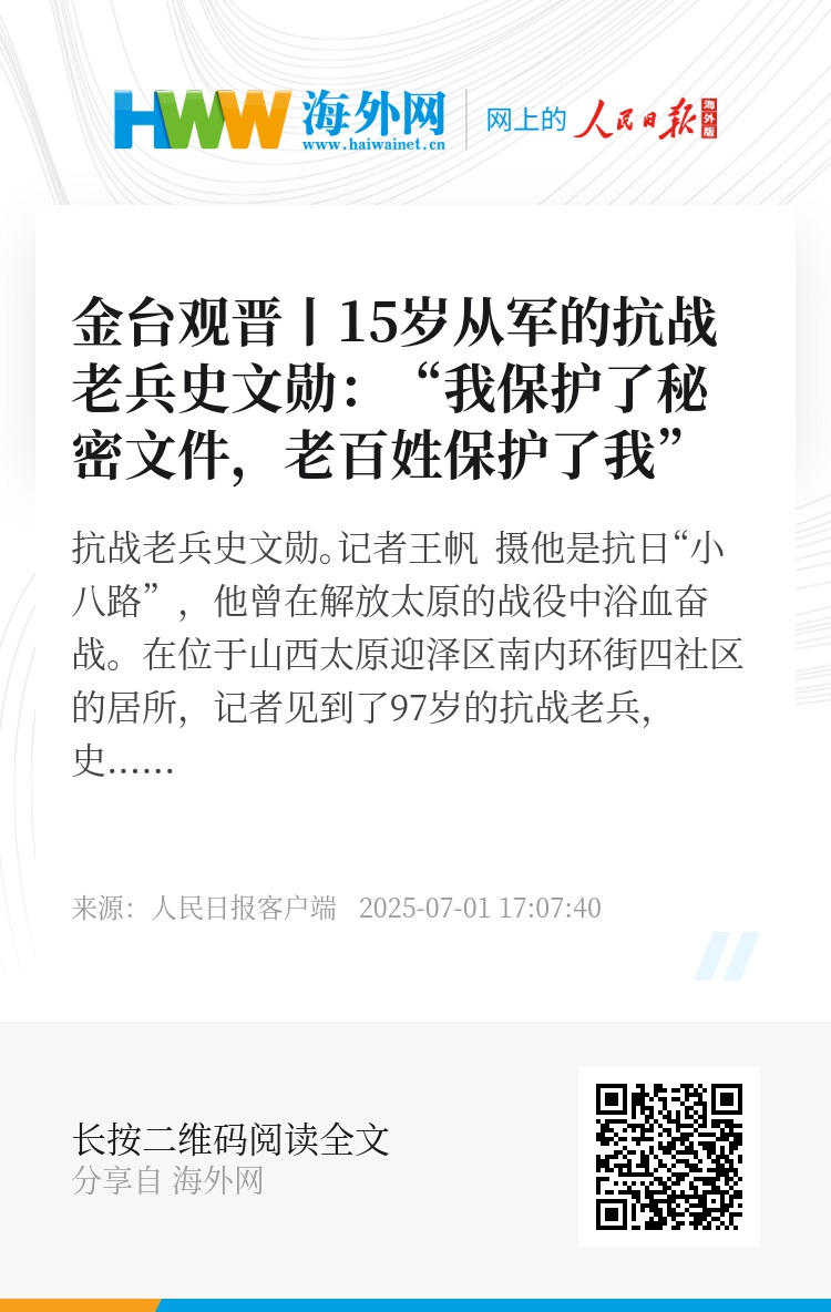 在位于山西太原迎泽区南内环街四社区的居所,记者见到了97岁的抗战老兵,史文勋。