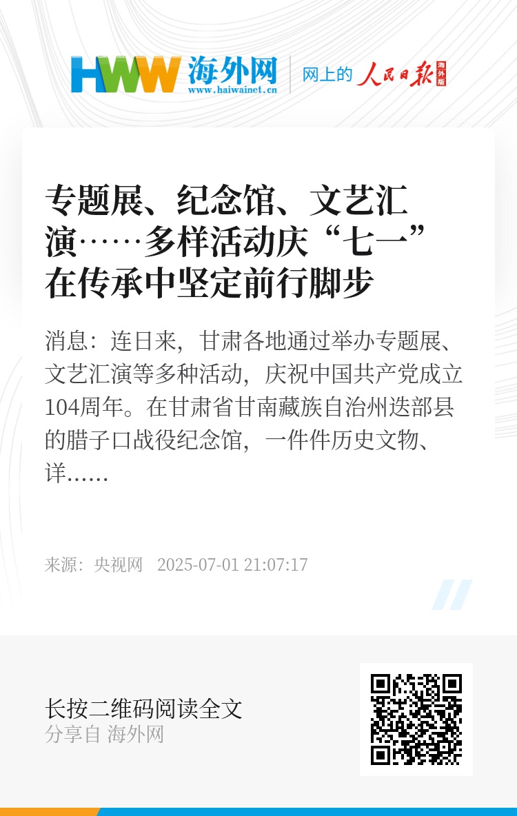 央视网消息:连日来,甘肃各地通过举办专题展、文艺汇演等多种活动,庆祝中国共产党成立104周年。