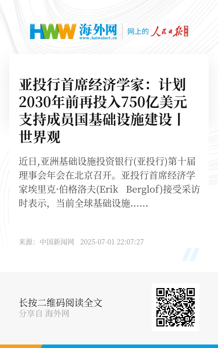 近日,亚洲基础设施投资银行(亚投行)第十届理事会年会在北京召开。亚投行首席经济学家埃里克·伯格洛夫(Erik Berglof)接受采访时表示,当前全球基础设施建设存在巨大缺口,亟需加大投入,以满足基本民生和应对气候变化的双重需求。