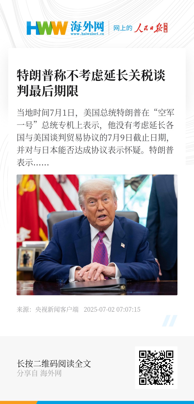 当地时间7月1日,美国总统特朗普在“空军一号”总统专机上表示,他没有考虑延长各国与美国谈判贸易协议的7月9日截止日期,并对与日本能否达成协议表示怀疑。