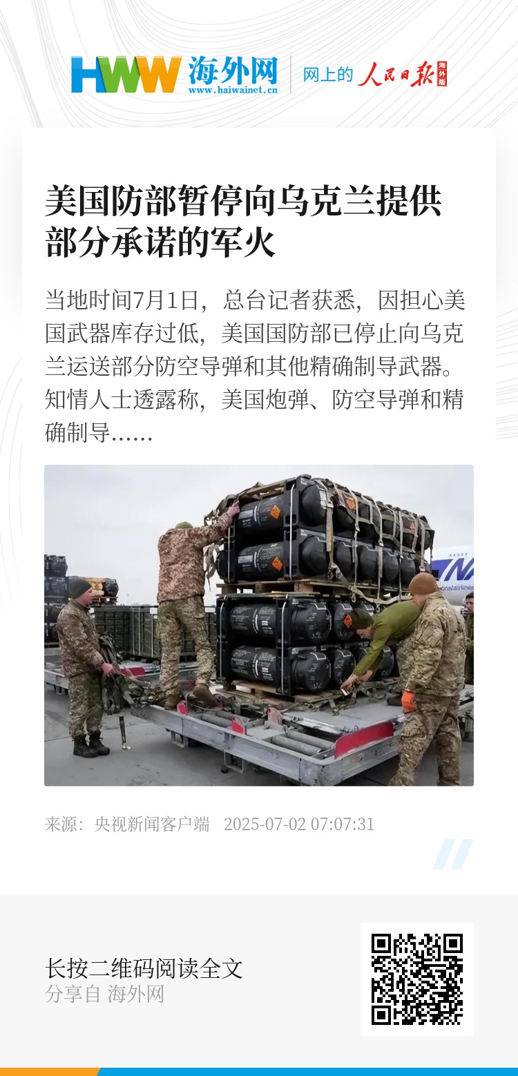 当地时间7月1日,总台记者获悉,因担心美国武器库存过低,美国国防部已停止向乌克兰运送部分防空导弹和其他精确制导武器。