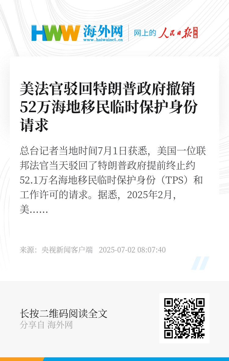 总台记者当地时间7月1日获悉,美国一位联邦法官当天驳回了特朗普政府提前终止约52.1万名海地移民临时保护身份(TPS)和工作许可的请求。