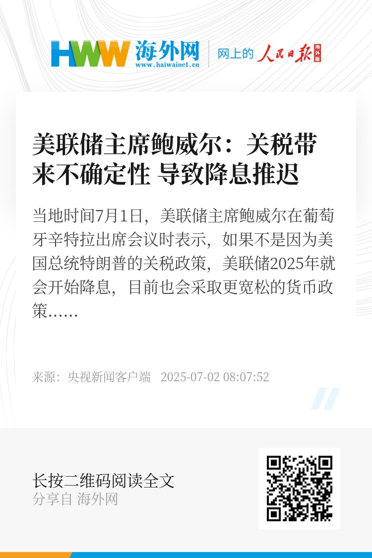 当地时间7月1日,美联储主席鲍威尔在葡萄牙辛特拉出席会议时表示,如果不是因为美国总统特朗普的关税政策,美联储2025年就会开始降息,目前也会采取更宽松的货币政策。