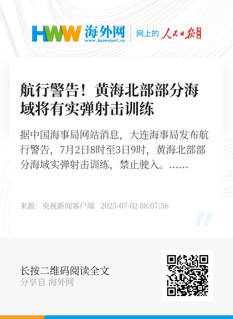 据中国海事局网站消息,大连海事局发布航行警告,7月2日8时至3日9时,黄海北部部分海域实弹射击训练,禁止驶入。