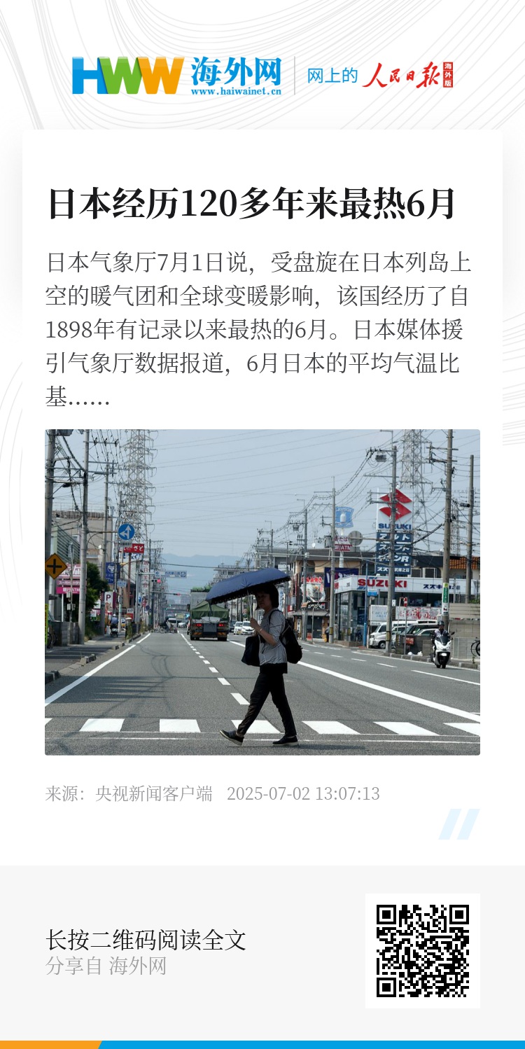 日本媒体援引气象厅数据报道,6月日本的平均气温比基准值(1991年至2020年的30年6月平均值)高2.34摄氏度,超过了2020年创下的纪录,当时的气温比基准值高1.43摄氏度。