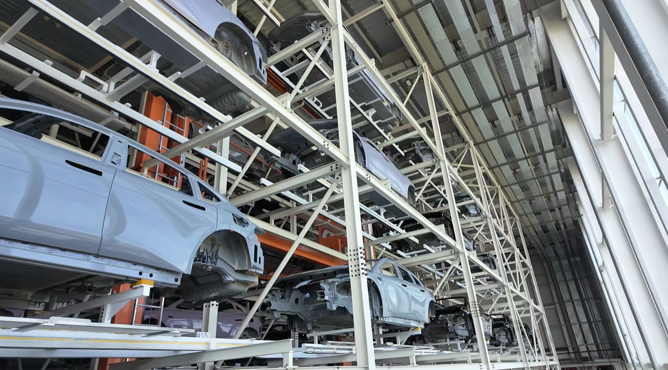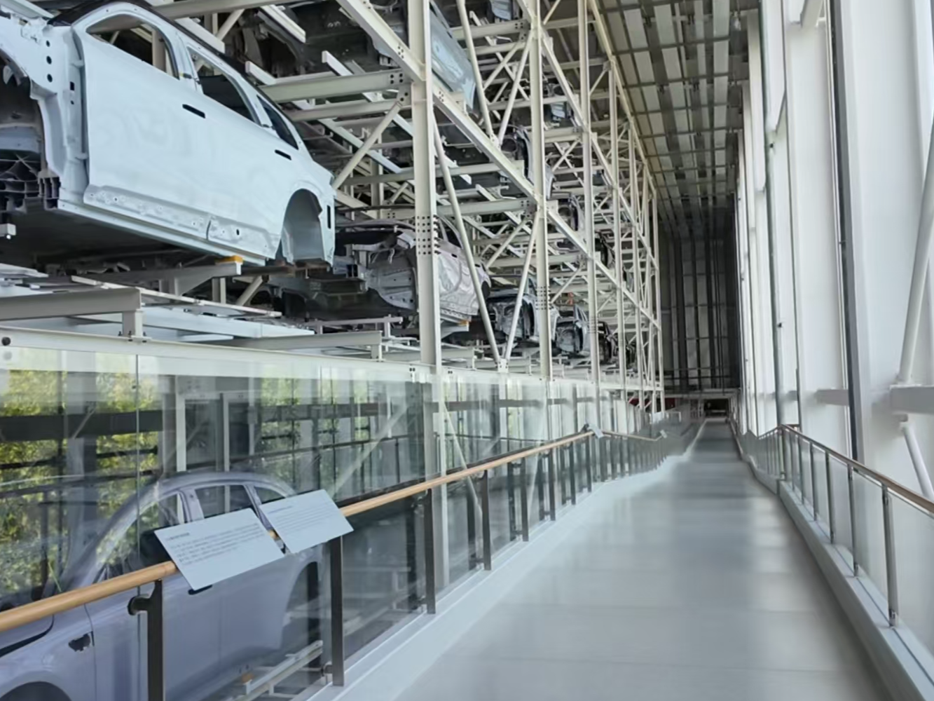 穿过空中连廊,脚下是令人惊叹的智能制造图景:右侧智能驾驶测试跑道车辆穿梭,左侧电控工厂内自动化设备高效运转。连廊尽头,全球首创的智能化RGV立体库吸引了大家的目光。6层立体库中设置了408个车位,如同巨型“抓娃娃机”,机械臂精准抓取不同颜色的车身,打破了传统“先进先出”的桎梏。