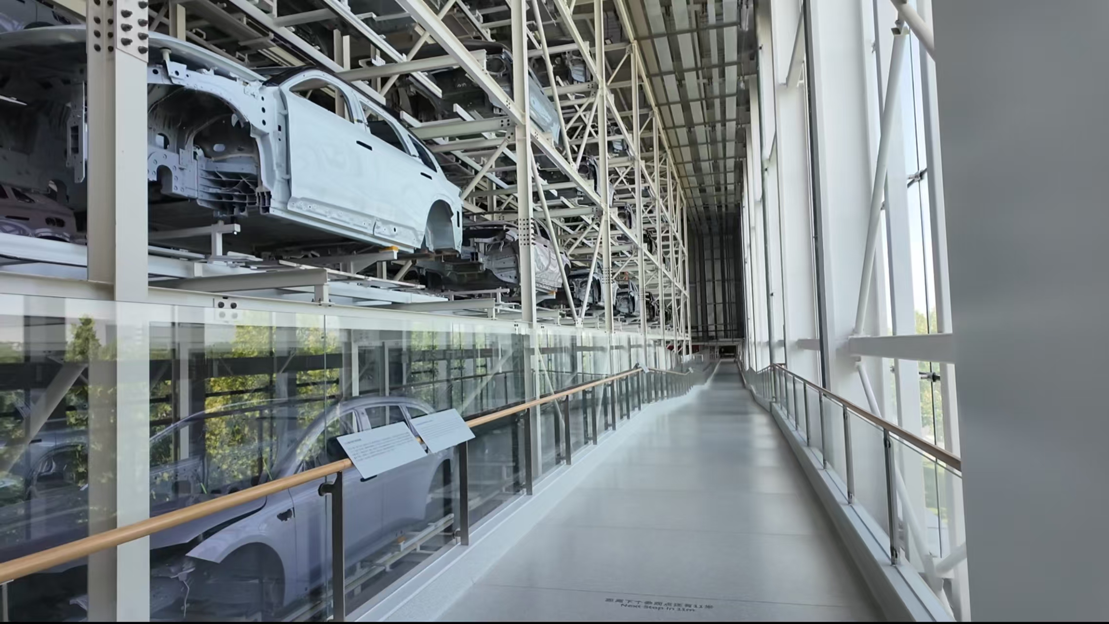 走进车身车间,941台机器人组成的全自动化产线正高效运作,在空中挥舞的机械臂仿佛正演绎现代工业芭蕾。记者注意到,这里没有飞溅的焊接火花,只有铆接枪精准的咔嗒声。“这台机械臂搭载了3D视觉系统,精度达到0.05毫米,相当于头发丝的1/15。”杨易指向正在安装车门的机器人——98秒内,四台机器人协作完成定位、匹配、铰链安装全套工序,“可以说又快又准。”