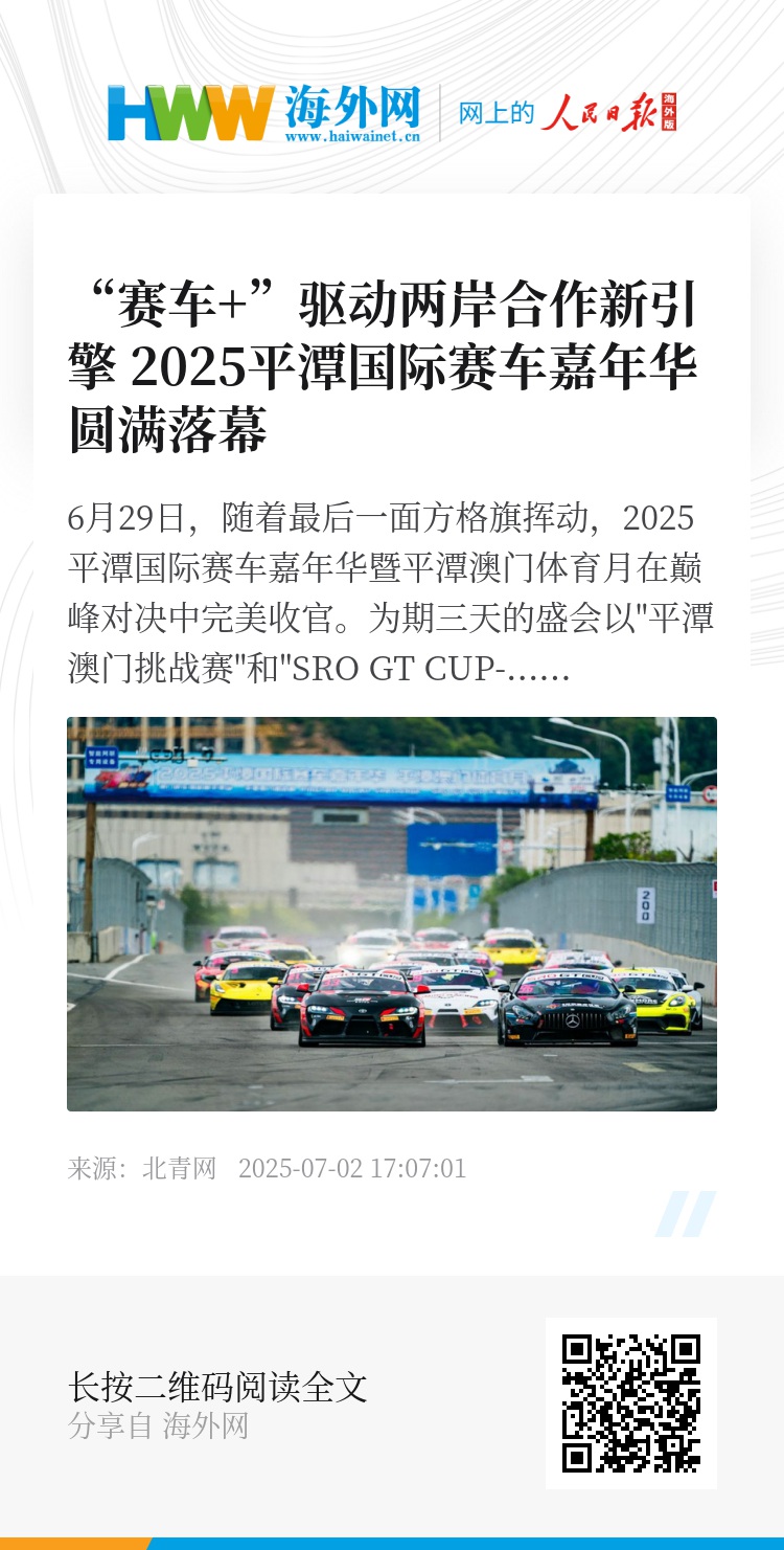 随着如意湖赛道胎痕渐淡,平潭"赛车+"模式开启的新航程已然启锚。这里的速度传奇,正在转化为两岸四地民心相通、产业共融的持久动能。(林彤欣)
