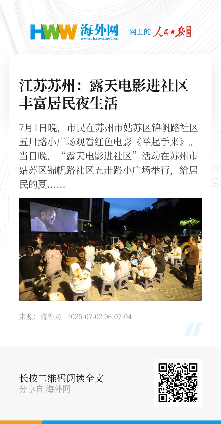 7月1日晚,市民在苏州市姑苏区锦帆路社区五卅路小广场观看红色电影《举起手来》。当日晚,“露天电影进社区”活动在苏州市姑苏区锦帆路社区五卅路小广场举行,给居民的夏夜生活增添了浓浓的文化氛围,吸引众多居民前来观看。图源:IC photo