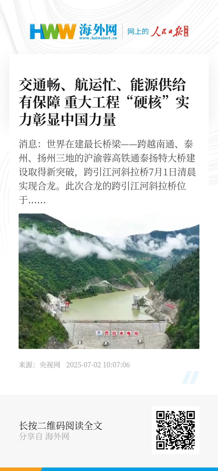 央视网消息:世界在建最长桥梁——跨越南通、泰州、扬州三地的沪渝蓉高铁通泰扬特大桥建设取得新突破,跨引江河斜拉桥7月1日清晨实现合龙。