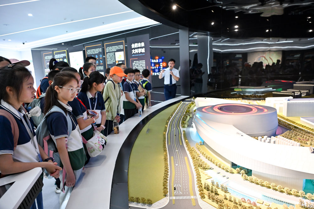 7月1日,学生们在位于安徽合肥聚变创新展览馆内的紧凑型聚变能实验装置(BEST)模型前参观学习。新华社记者 张铖 摄