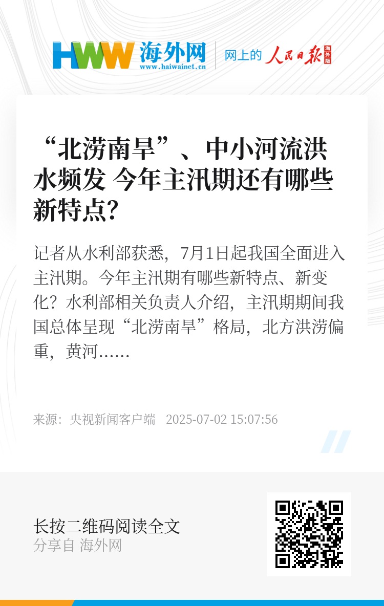 记者从水利部获悉,7月1日起我国全面进入主汛期。今年主汛期有哪些新特点、新变化?