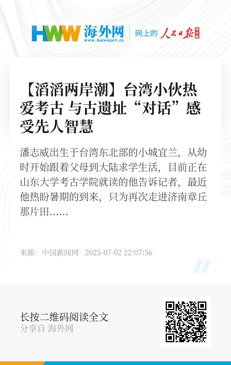 潘志威出生于台湾东北部的小城宜兰,从幼时开始跟着父母到大陆求学生活,目前正在山东大学考古学院就读的他告诉记者,最近他热盼暑期的到来,只为再次走进济南章丘那片田野,在距今5000多年的焦家遗址上溯源历史、解码文明。