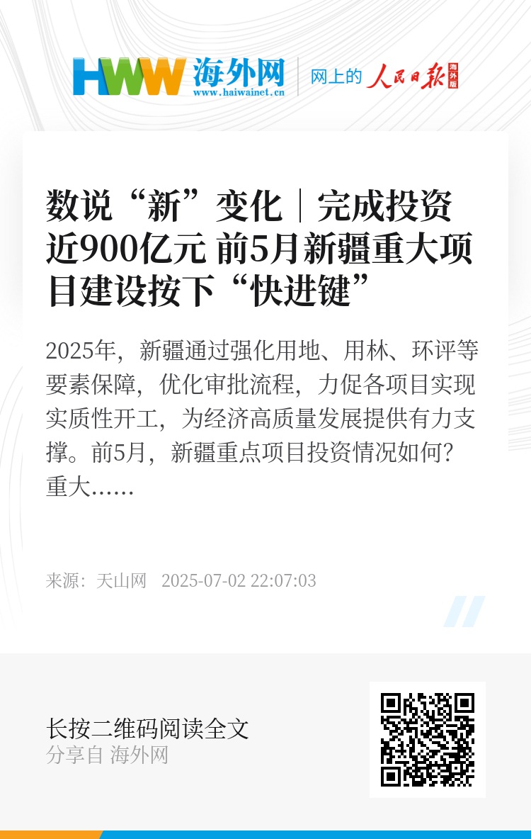 2025年,新疆通过强化用地、用林、环评等要素保障,优化审批流程,力促各项目实现实质性开工,为经济高质量发展提供有力支撑。前5月,新疆重点项目投资情况如何?重大产业项目推进情况怎样?近期,自治区发展改革委发布相关数据。今天的《数说“新”变化》一起来看看。