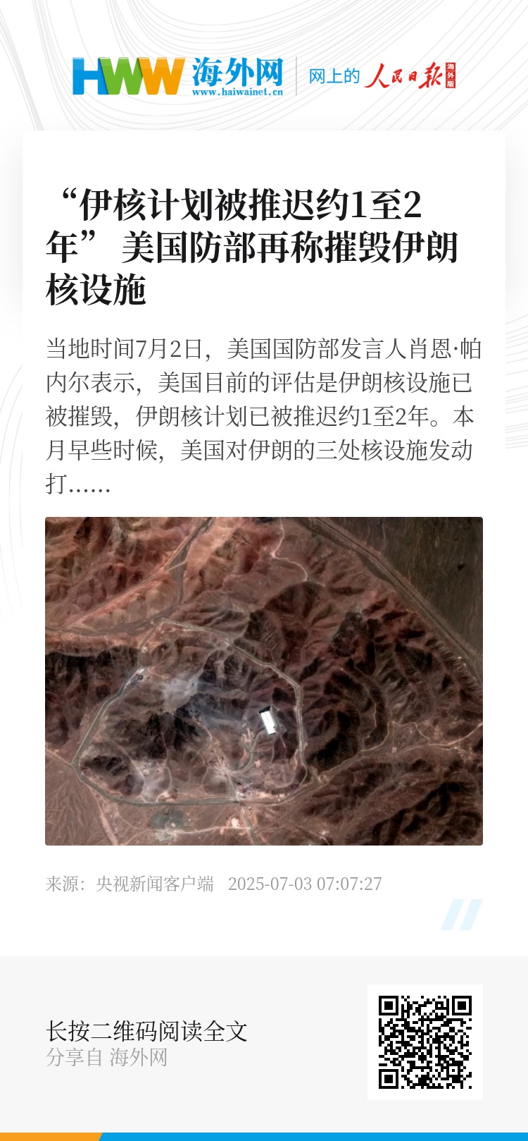 当地时间7月2日,美国国防部发言人肖恩·帕内尔表示,美国目前的评估是伊朗核设施已被摧毁,伊朗核计划已被推迟约1至2年。
