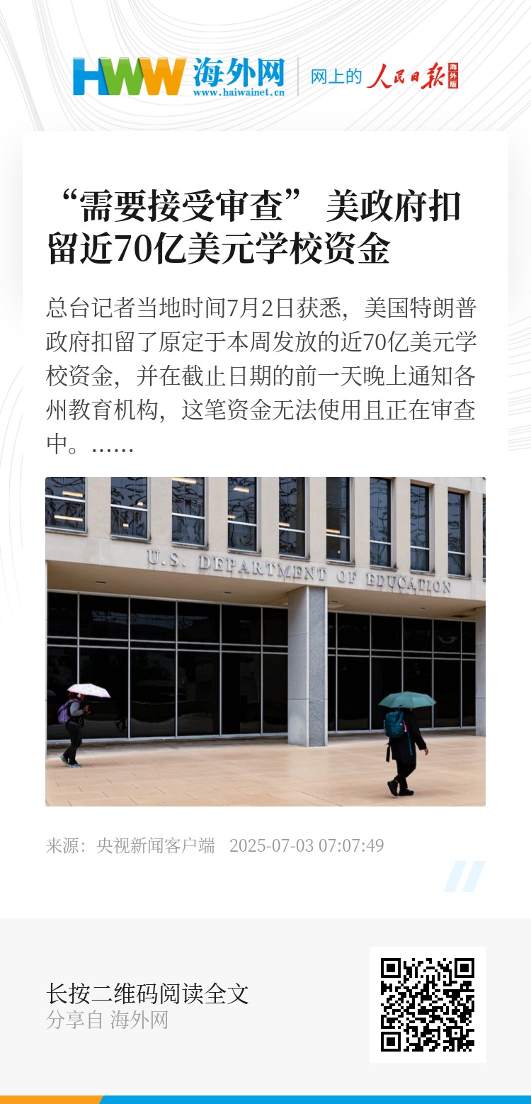 总台记者当地时间7月2日获悉,美国特朗普政府扣留了原定于本周发放的近70亿美元学校资金,并在截止日期的前一天晚上通知各州教育机构,这笔资金无法使用且正在审查中。