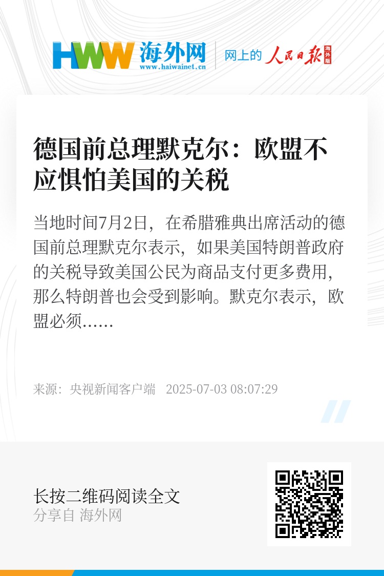 当地时间7月2日,在希腊雅典出席活动的德国前总理默克尔表示,如果美国特朗普政府的关税导致美国公民为商品支付更多费用,那么特朗普也会受到影响。