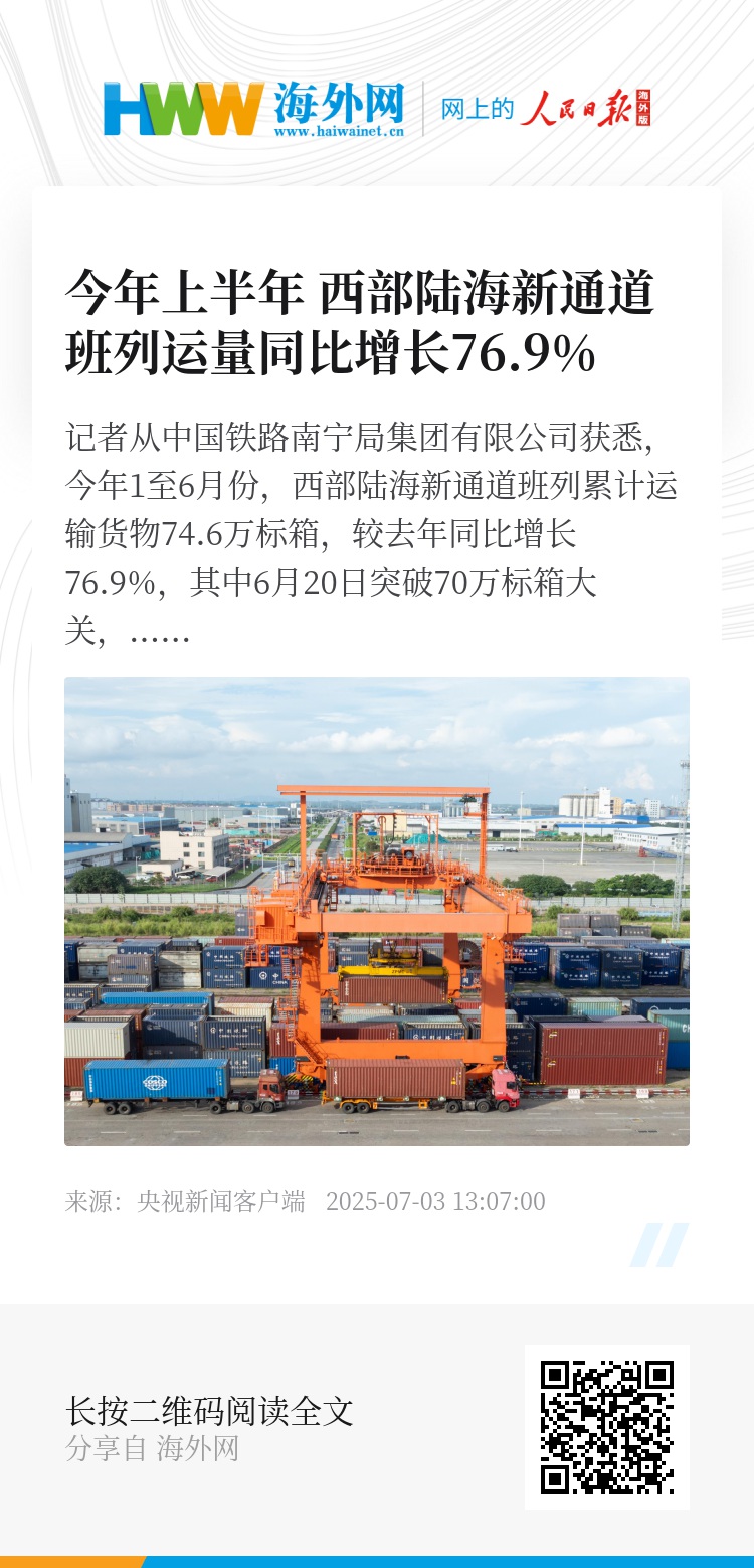 记者从中国铁路南宁局集团有限公司获悉,今年1至6月份,西部陆海新通道班列累计运输货物74.6万标箱,较去年同比增长76.9%,其中6月20日突破70万标箱大关,较去年提前125天刷新纪录。