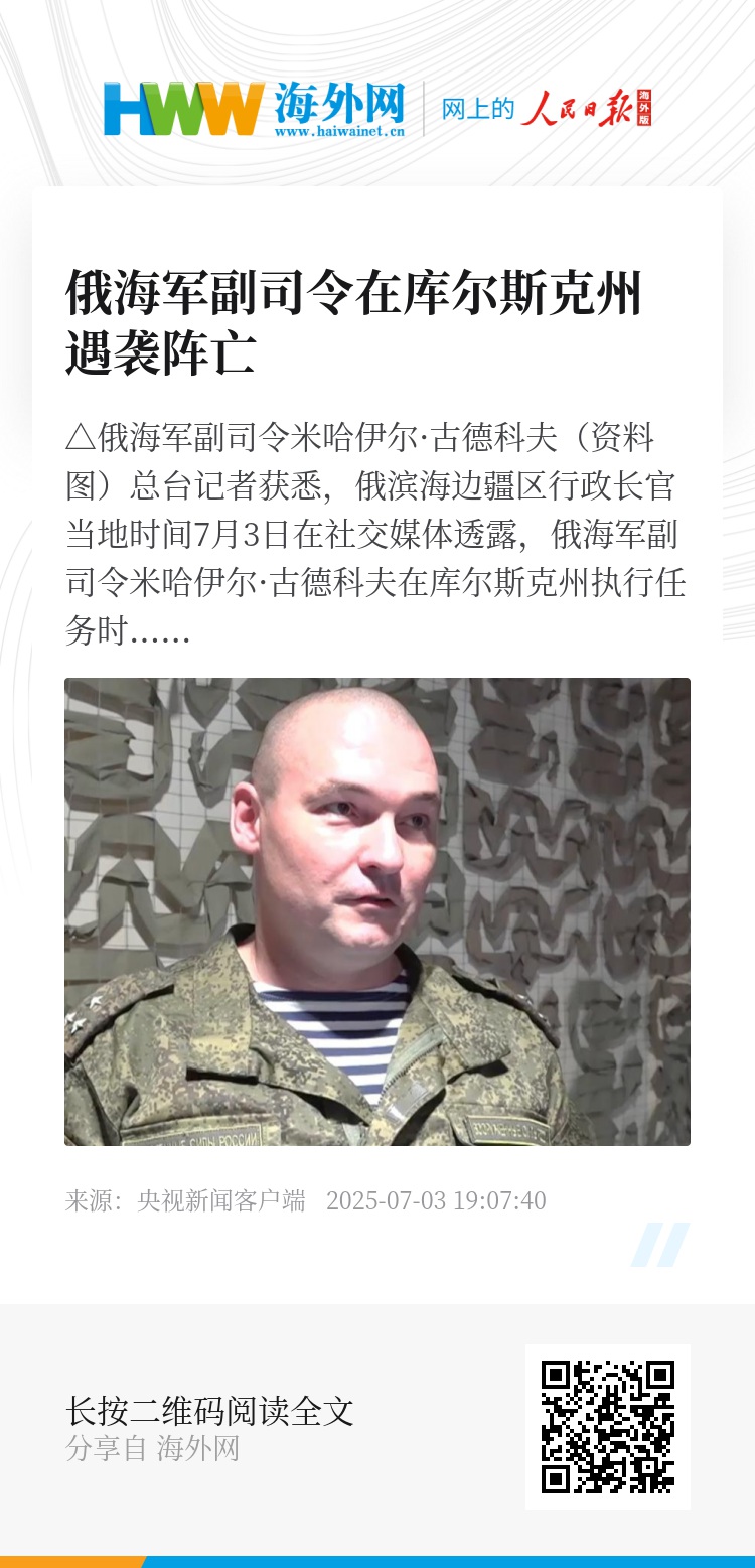 总台记者获悉,俄滨海边疆区行政长官当地时间7月3日在社交媒体透露,俄海军副司令米哈伊尔·古德科夫在库尔斯克州执行任务时与另一位军官纳里曼·希哈利耶夫一同遇袭阵亡。(总台记者 王斌 王德禄)