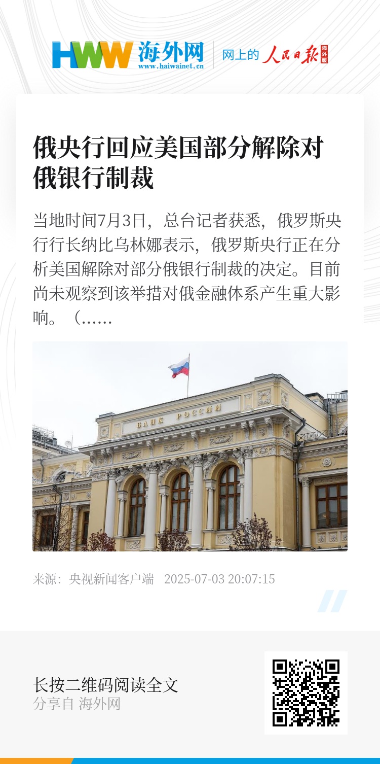 当地时间7月3日,总台记者获悉,俄罗斯央行行长纳比乌林娜表示,俄罗斯央行正在分析美国解除对部分俄银行制裁的决定。目前尚未观察到该举措对俄金融体系产生重大影响。(总台记者 程谟)