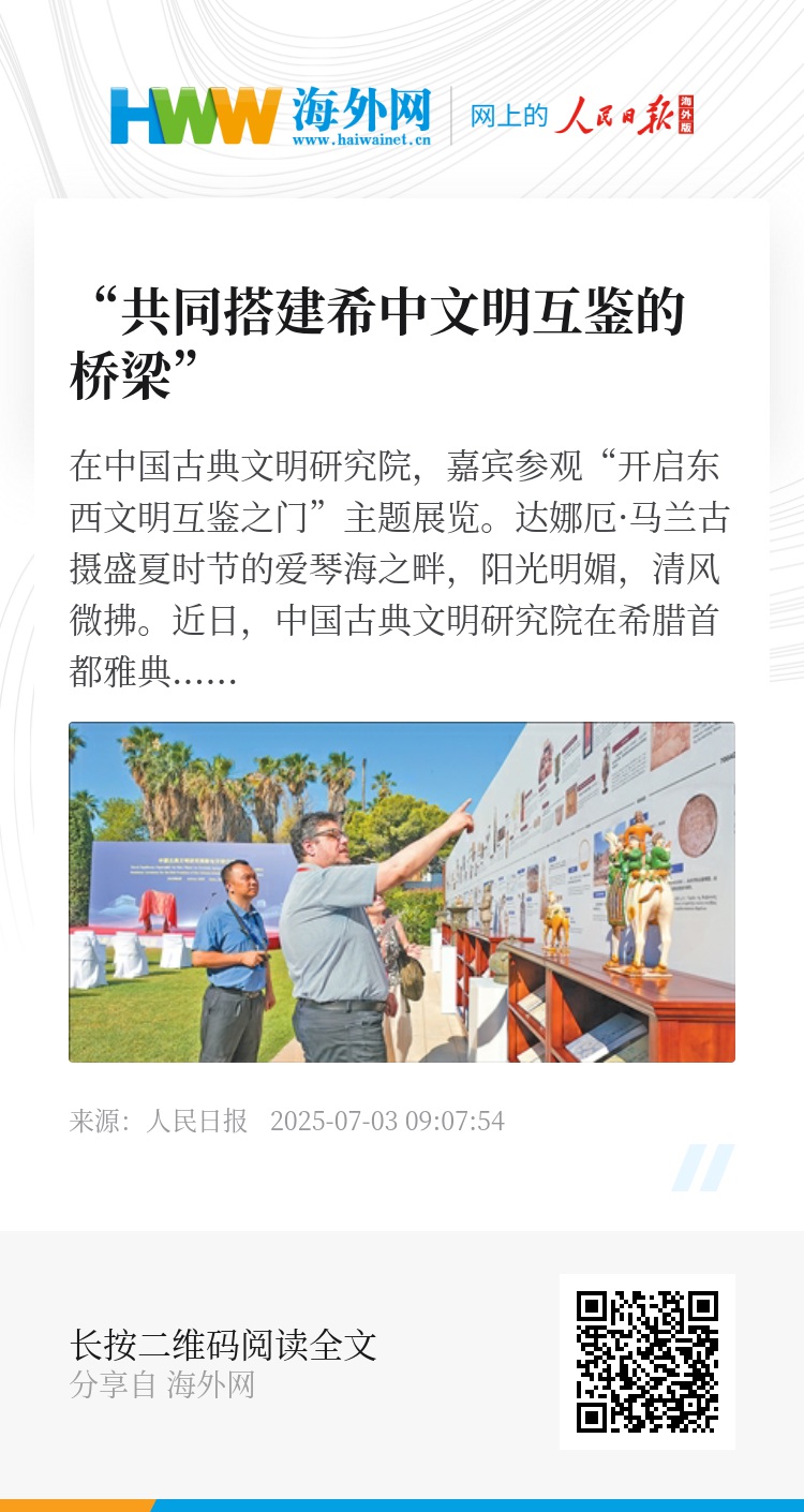 近来中希文化交流活动丰富。6月10日首个联合国“文明对话国际日”当天,“古都文明对话”交流活动在雅典举办;6月14日,以“文明与和平:从帕特农神庙到圆明园”为主题的“古都文明对话”交流活动在北京举行。中希专家学者与青年学子齐聚一堂,溯源文明根脉,共议百年变局下的文化担当,探讨古老文明在当代的传承创新与对话价值。